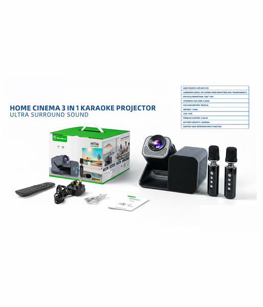 The Smartbarry HT36 3-in-1 Projector is a premium multimedia device that combines a high-brightness projector, a powerful speaker, and a built-in smart Android system — all in one compact machine.